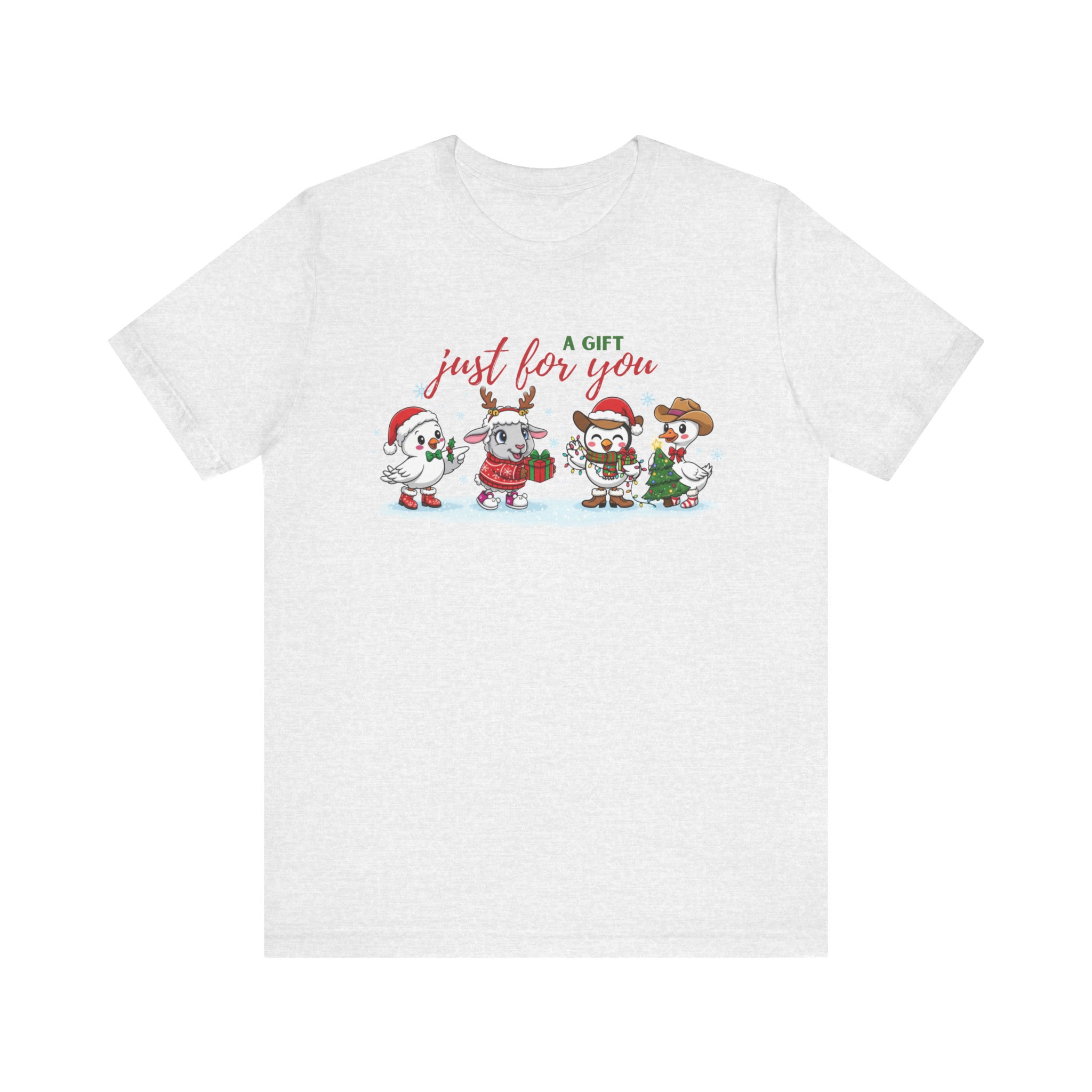 The A Gift Just for You – Unisex Christmas T-Shirt captures the true joy of giving and togetherness this season. Featuring four charming holiday characters — a snowman, reindeer, penguin, and bird — joyfully holding gifts under festive lights, this design radiates kindness, generosity, and Christmas spirit.