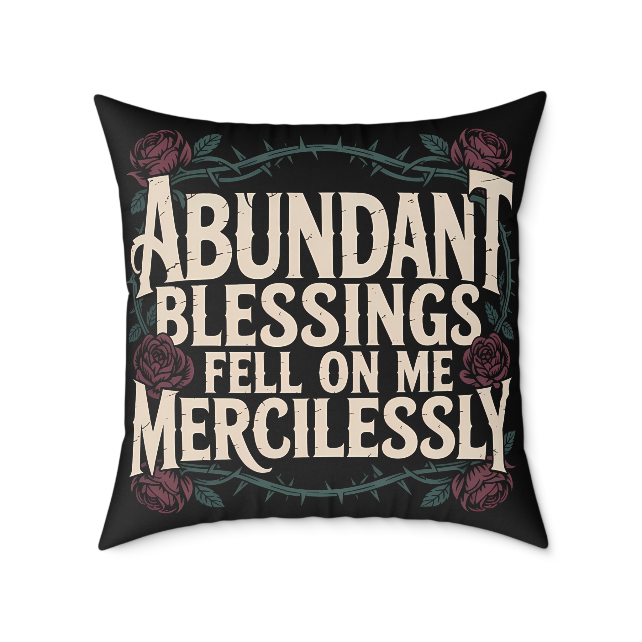 The Abundant Blessings Decorative Throw Pillow transforms any space into a sanctuary of faith and comfort. Crafted from soft poly canvas, this square pillow features the inspiring phrase “Abundant Blessings fell on me mercilessly,” celebrating God’s favor with vibrant colors and elegant design.