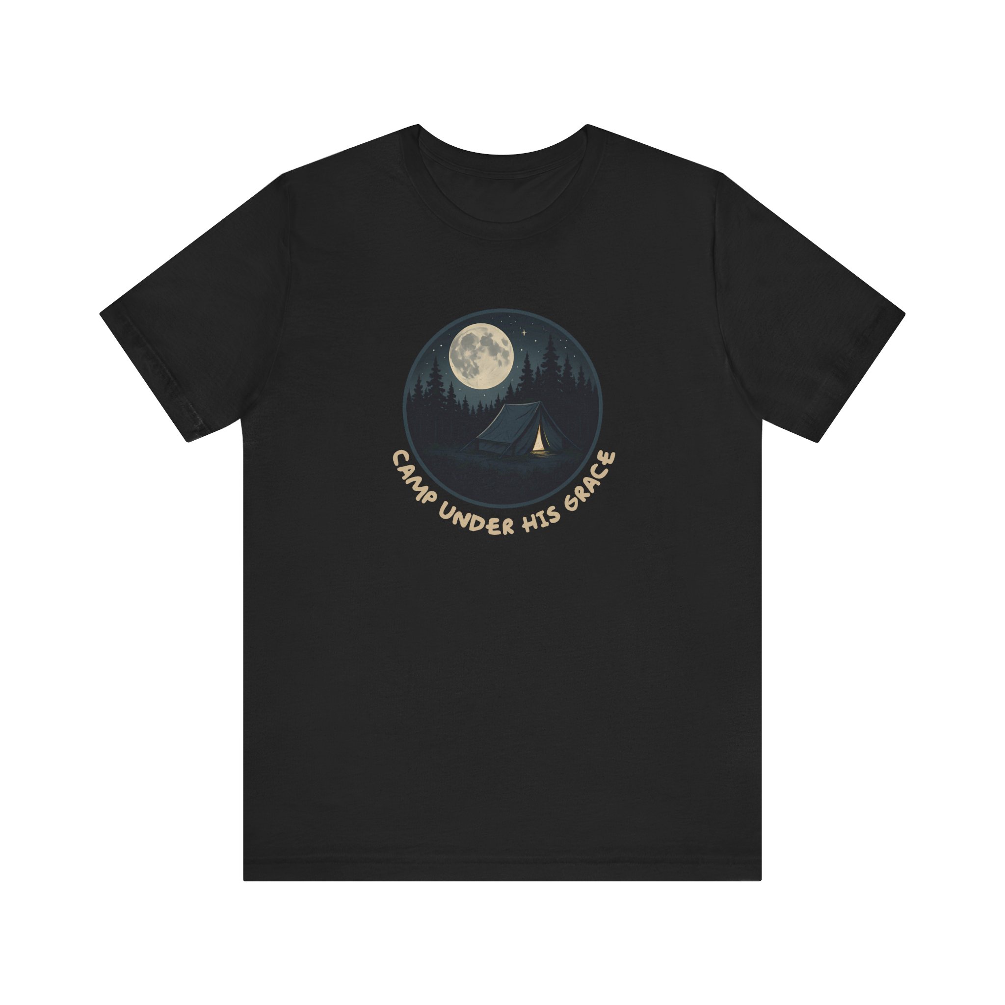 The Camp Under His Grace Unisex Christian Camping Tee is perfect for believers who love nature and want to showcase their faith in the great outdoors. Featuring a retro badge-style graphic of pine trees, a glowing moon, and a cozy tent, this tee serves as a stylish reminder that God’s grace accompanies every adventure.