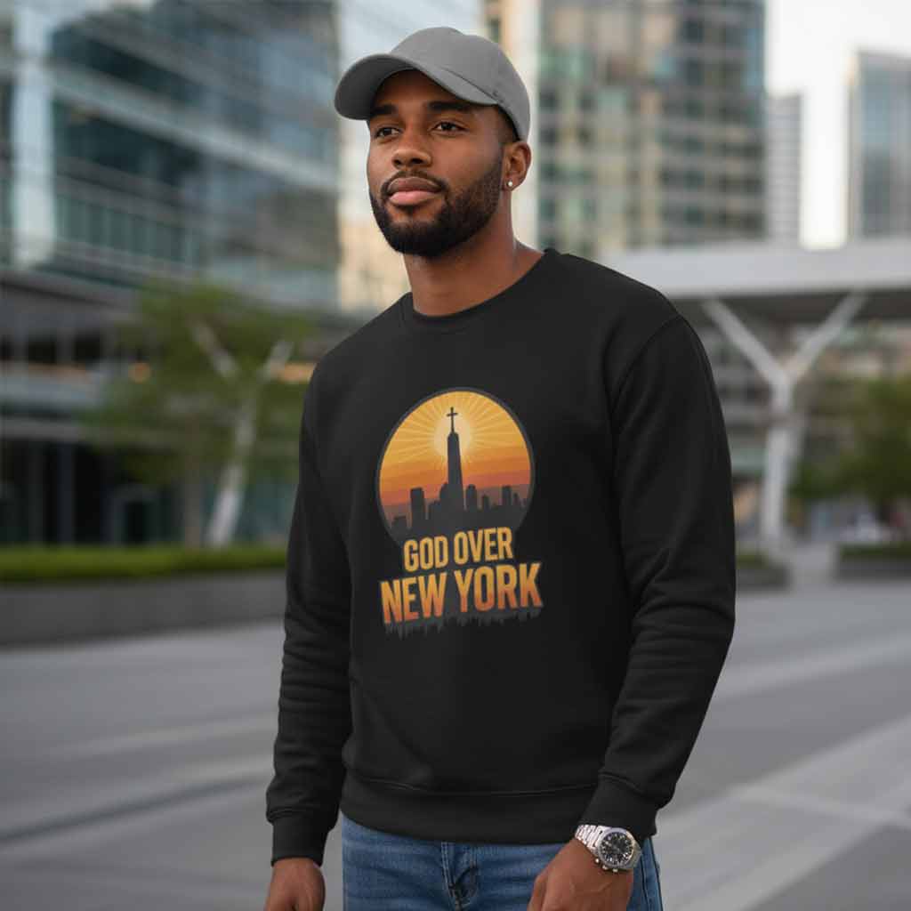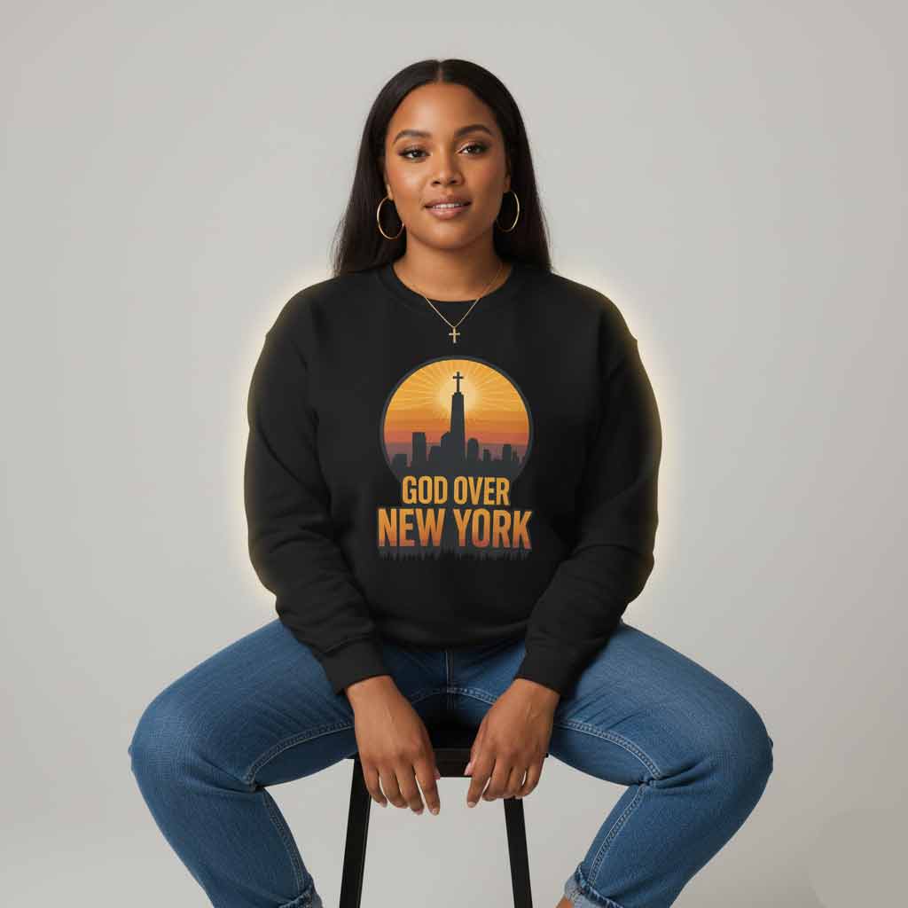 This “God Over New York – Unisex Christian Sweatshirt” combines urban style with an unshakable declaration of faith. Featuring a striking New York skyline crowned with a radiant cross, this Christian Sweatshirt reminds believers that God reigns above every city, every season, and every circumstance. Soft, comfortable, and boldly expressive—perfect for worship nights, city strolls, or everyday faith wear.