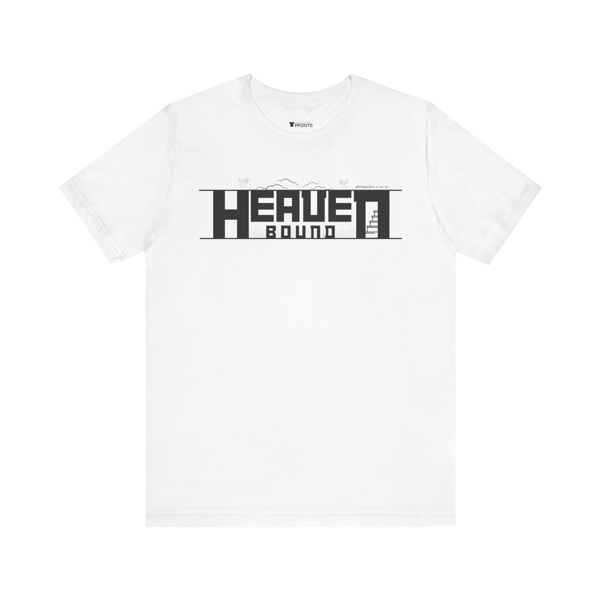 The monochrome design features the words “Heaven Bound” in a strong geometric font, framed by subtle symbolic details like angel wings, clouds, and a stairway leading upward — each element reminding you of your divine destination. Perfect for everyday wear, ministry events, or casual outings, this tee blends minimal style with deep spiritual meaning.
