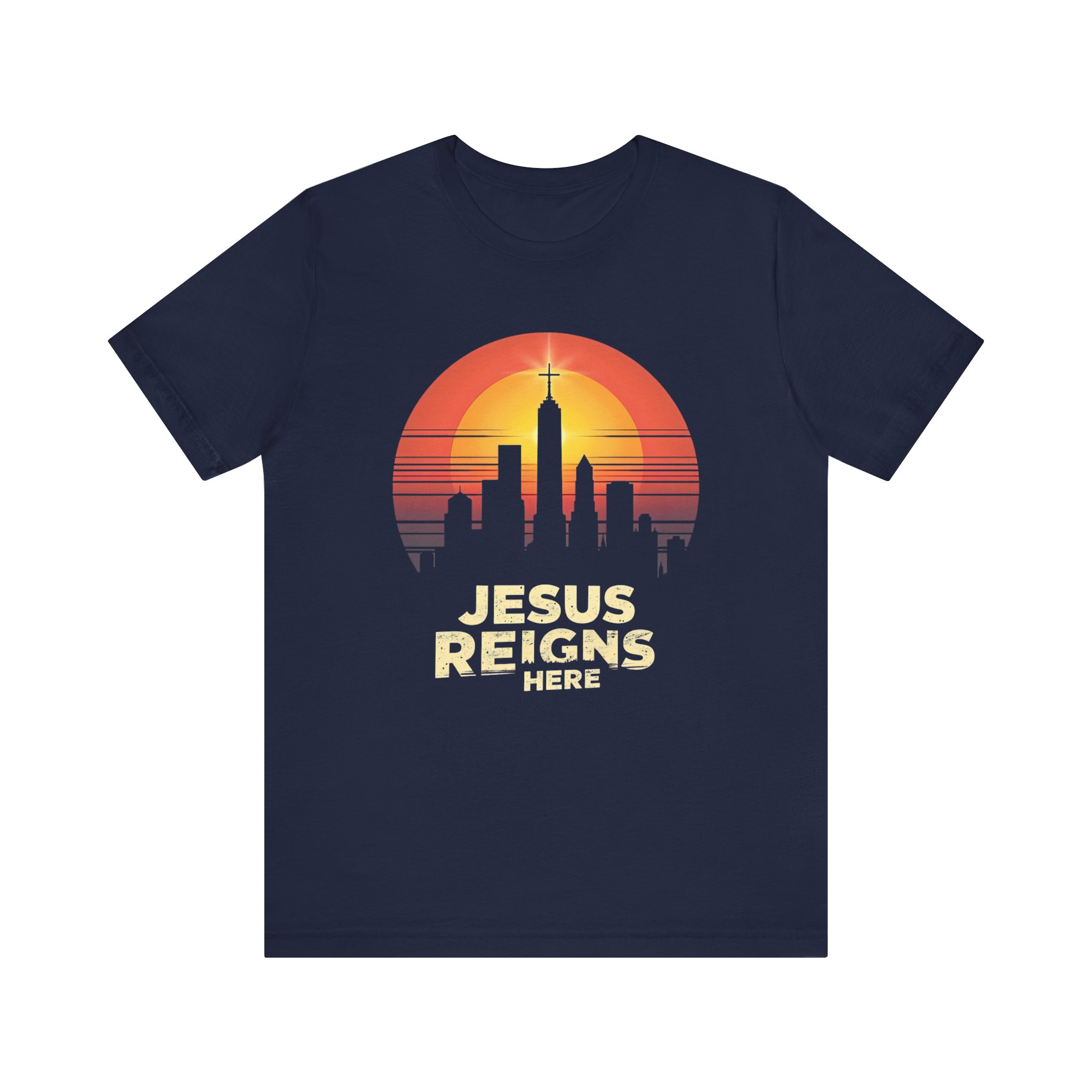The Jesus Reigns Here Unisex Christian T-Shirt captures faith and city life in one inspired design — where Christ’s name stands tall above every skyline. Featuring a retro sunset and the bold phrase “Jesus Reigns Here” over the silhouette of New York City, this tee speaks truth over culture and declares that the King still reigns — everywhere, every day.