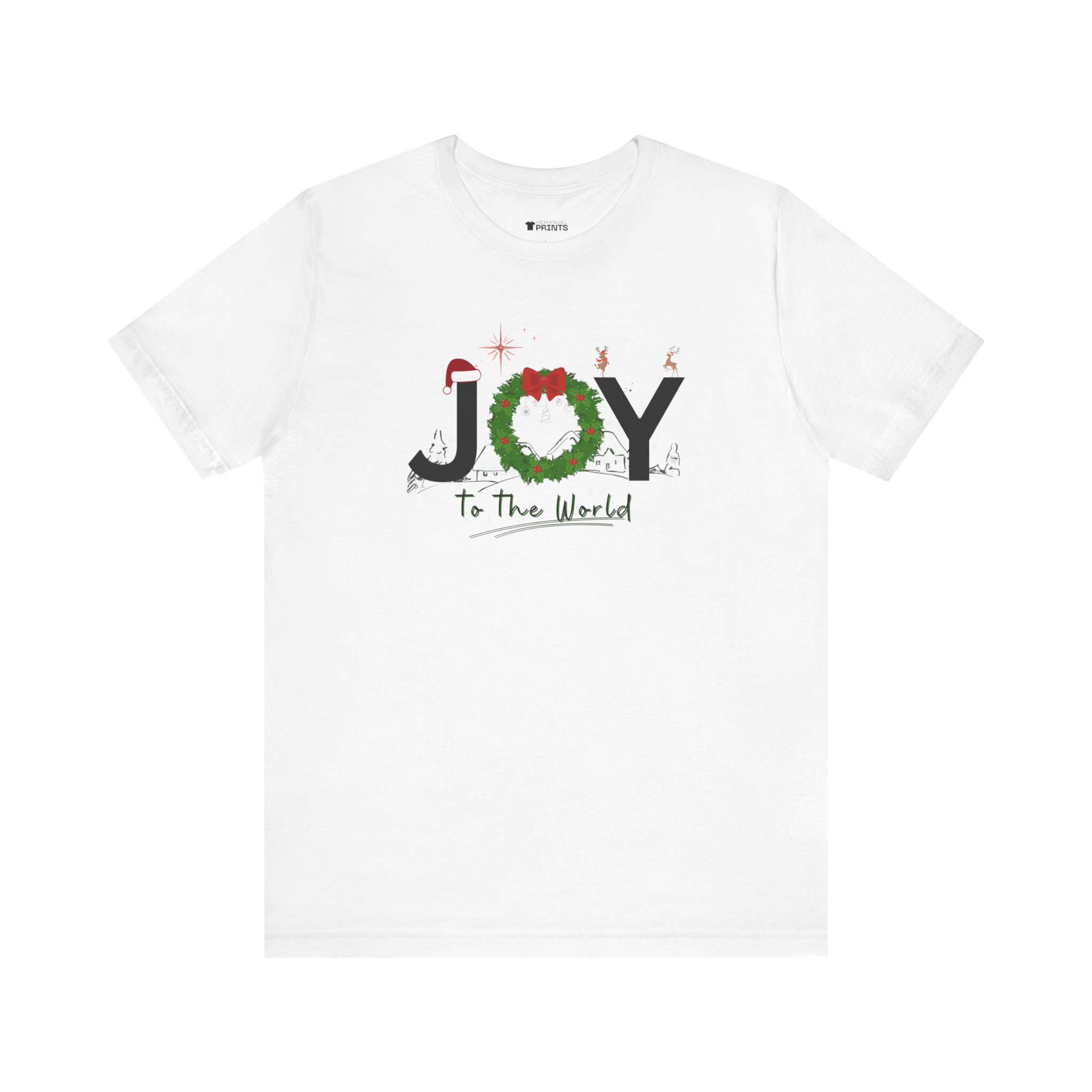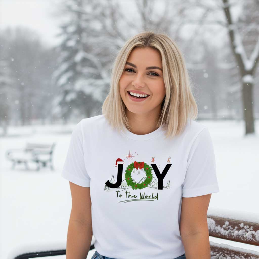 The Joy to the World – Christmas Faith-Inspired Unisex T-Shirt is a joyful celebration of hope, light, and love — the very essence of the Christmas message. Designed with a cheerful “JOY” typography, the “O” is beautifully replaced by a green holiday wreath tied with a red bow, surrounded by festive stars, reindeer, and a subtle winter village illustration beneath.