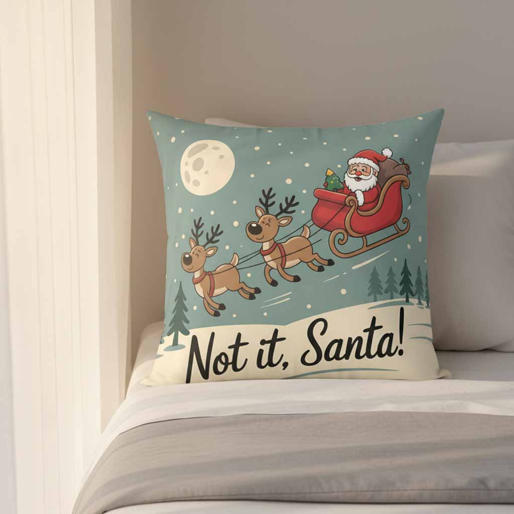 The Not It, Santa! – Christmas Decorative Pillow adds a fun and lighthearted twist to traditional Christmas décor. Featuring cheerful cartoon artwork of Santa in his sleigh, led by two mischievous reindeer under a glowing moon, this design captures the humor and joy of the holiday season.