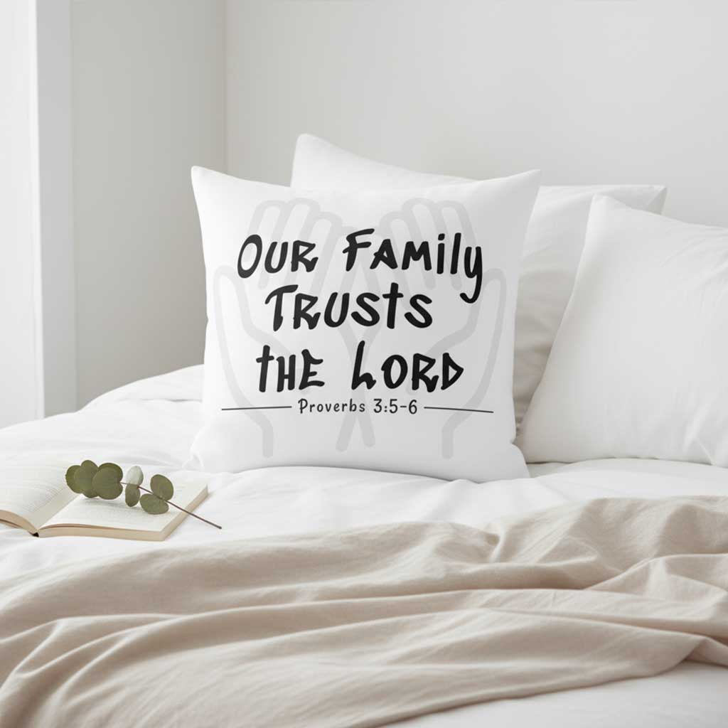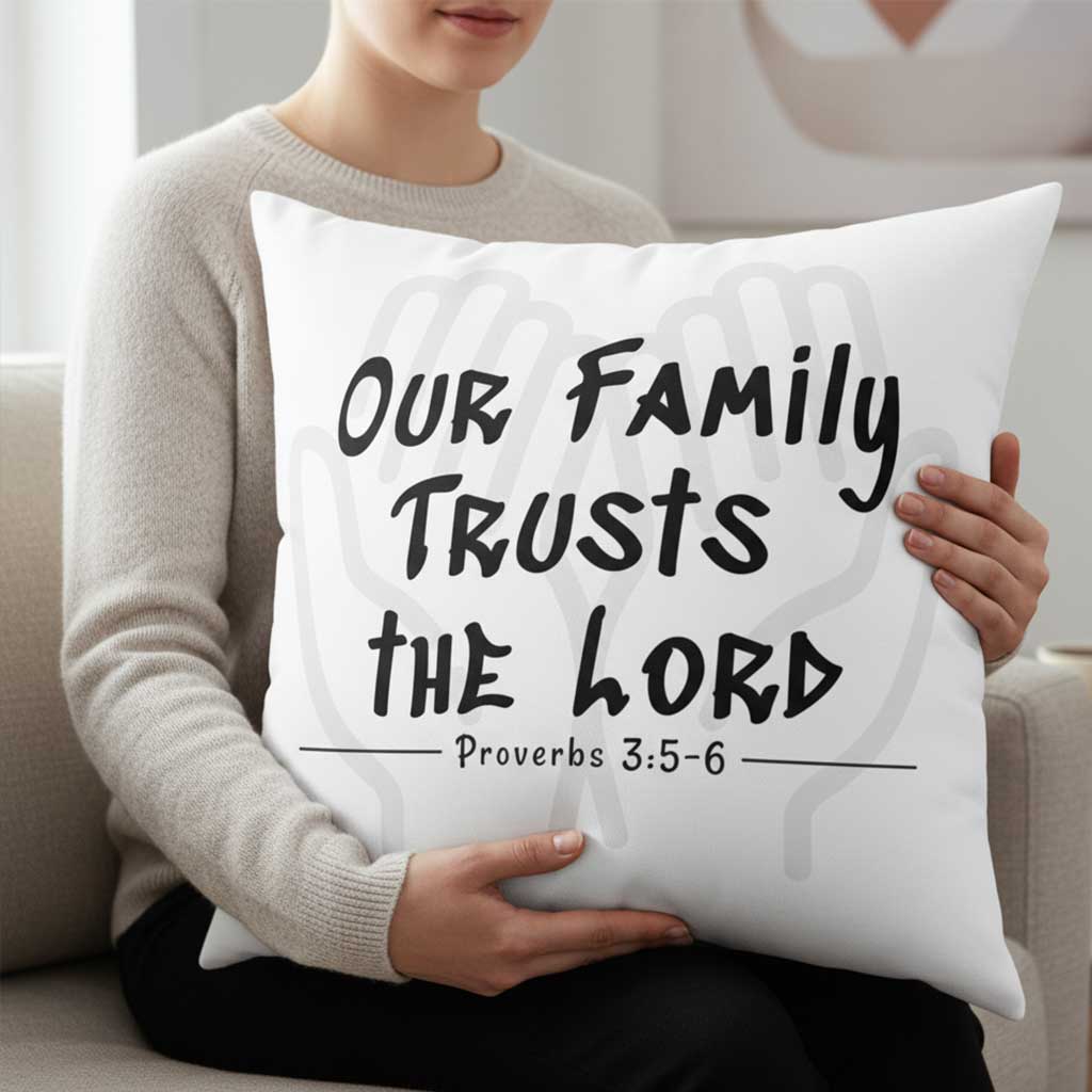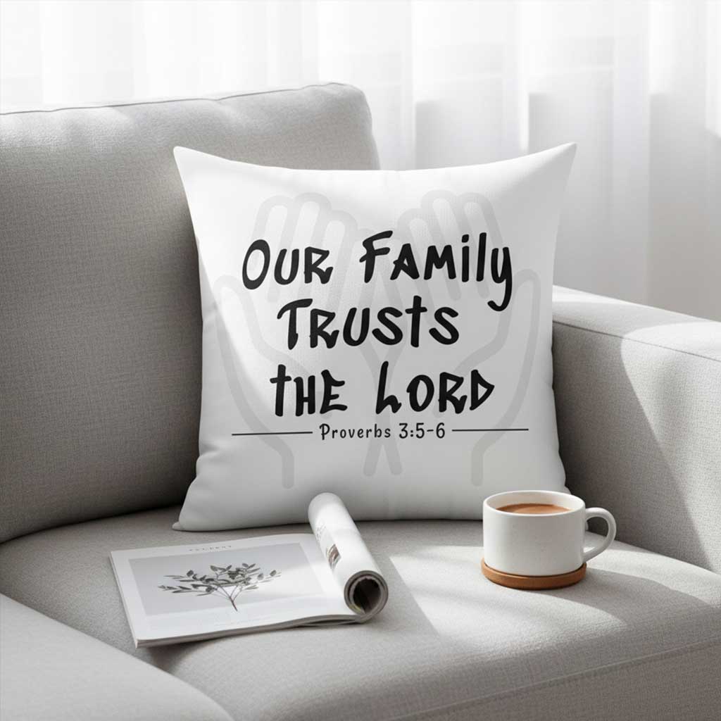This “Our Family Trusts the Lord – Christian Throw Pillow” is a comforting reminder of Proverbs 3:5–6, designed to fill your home with faith, unity, and God-centered peace. This scripture-inspired Christian Throw Pillow makes the perfect addition to living rooms, bedrooms, and family spaces seeking to reflect trust in God daily.