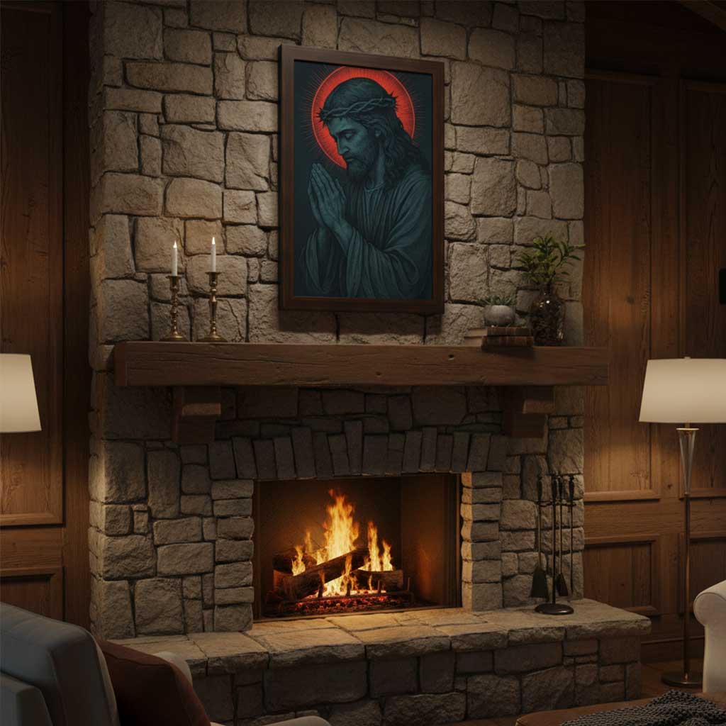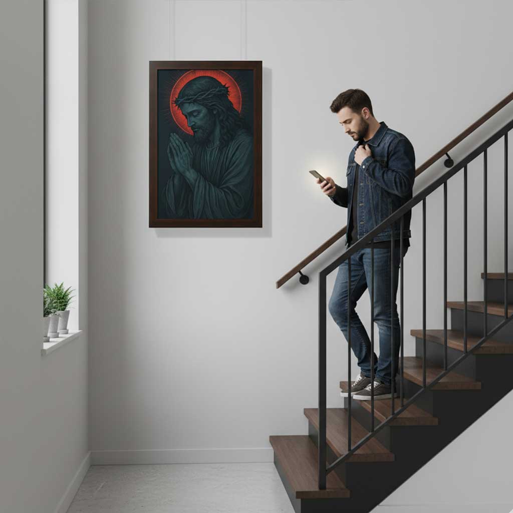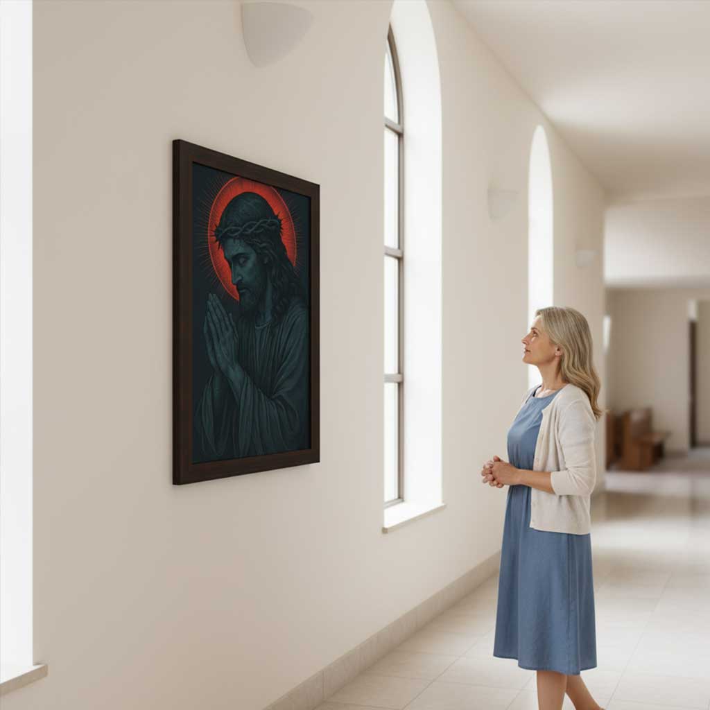 This “The Praying Savior – Inspirational Wall Art” beautifully captures a sacred moment of Christ in solemn prayer, crowned with a radiant red halo symbolizing divine sacrifice and holy reverence. This striking Inspirational Wall Art brings a deep sense of peace, devotion, and spiritual reflection into any room, serving as a timeless reminder of Jesus’ humility, love, and intercession.